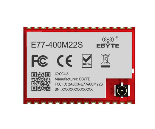 [Introduction]:E77-400M22S is a standard LoRaWan node module designed and produced by Ebyte, with an operating frequency band of 410~510MHZ, supports LoRaWAN 1.0.3 EU433/CN470 standards, supports CLASS-A/CLASS-C node types, and supports two network access methods: ABP/OTAA. At the same time, the LoRa module has a variety of low-power modes, and the external communication interface uses a standard UART. Users can access the standard LoRaWAN network through simple configuration of AT commands, which is an excellent choice for current IoT applications.